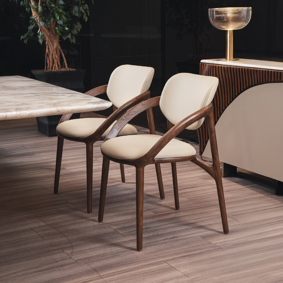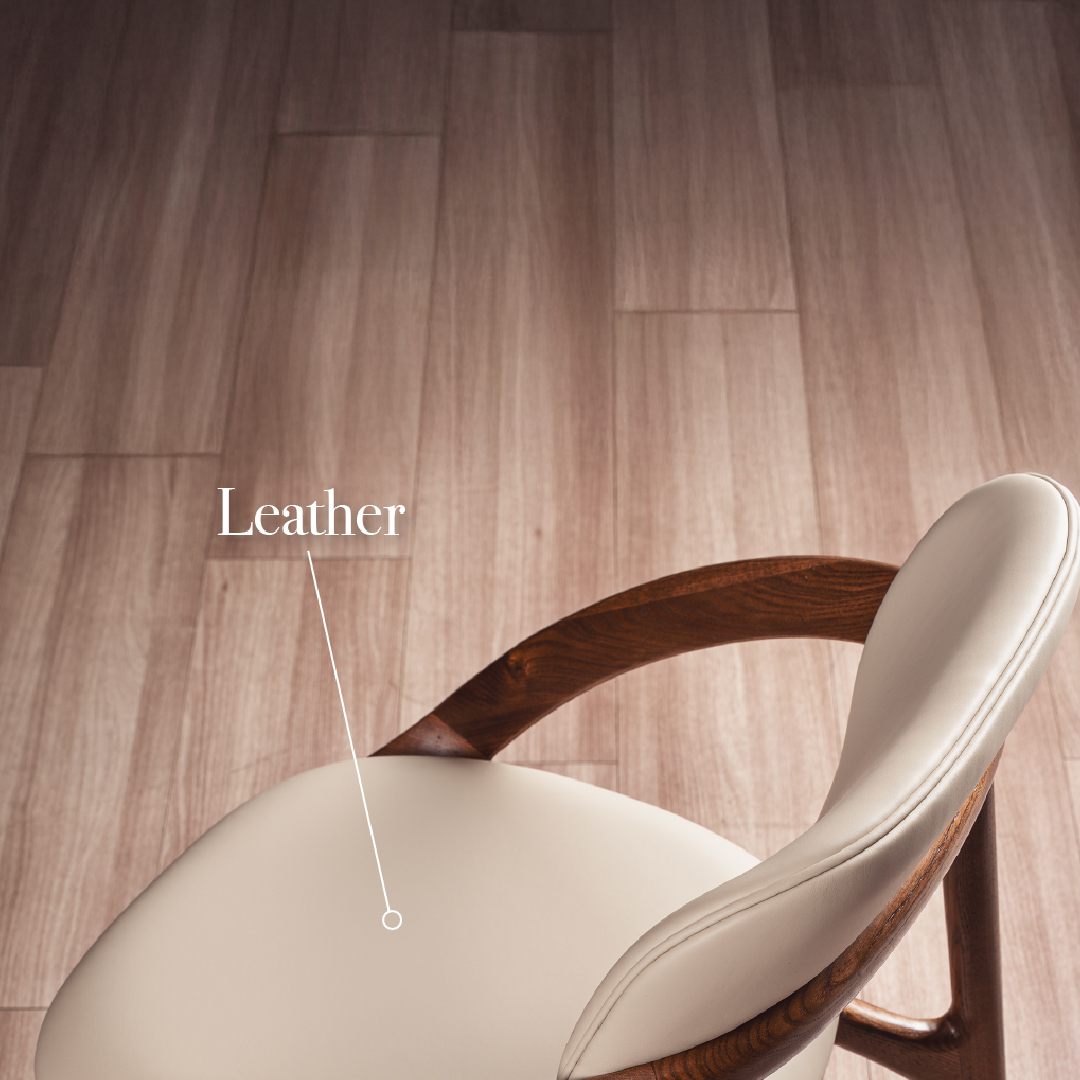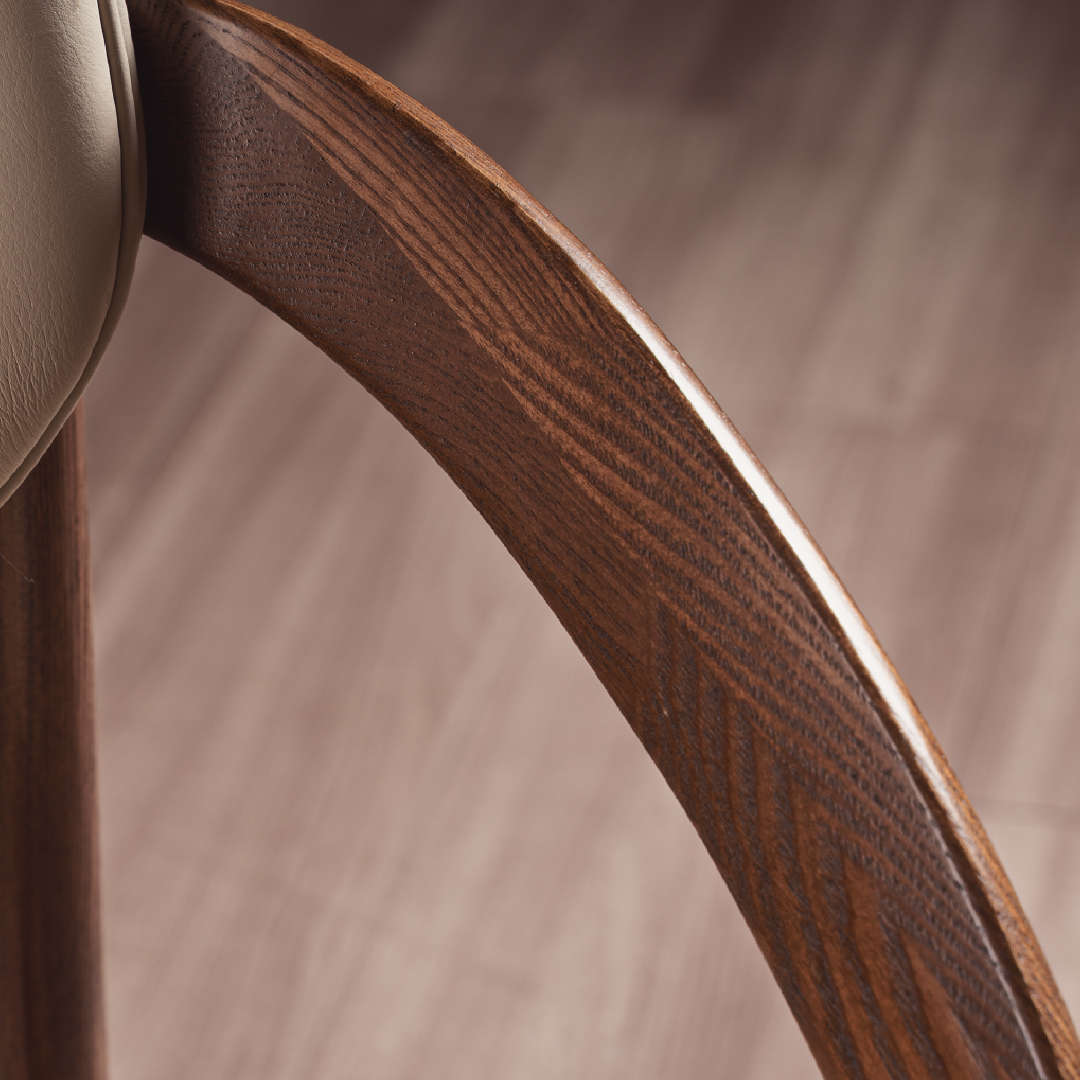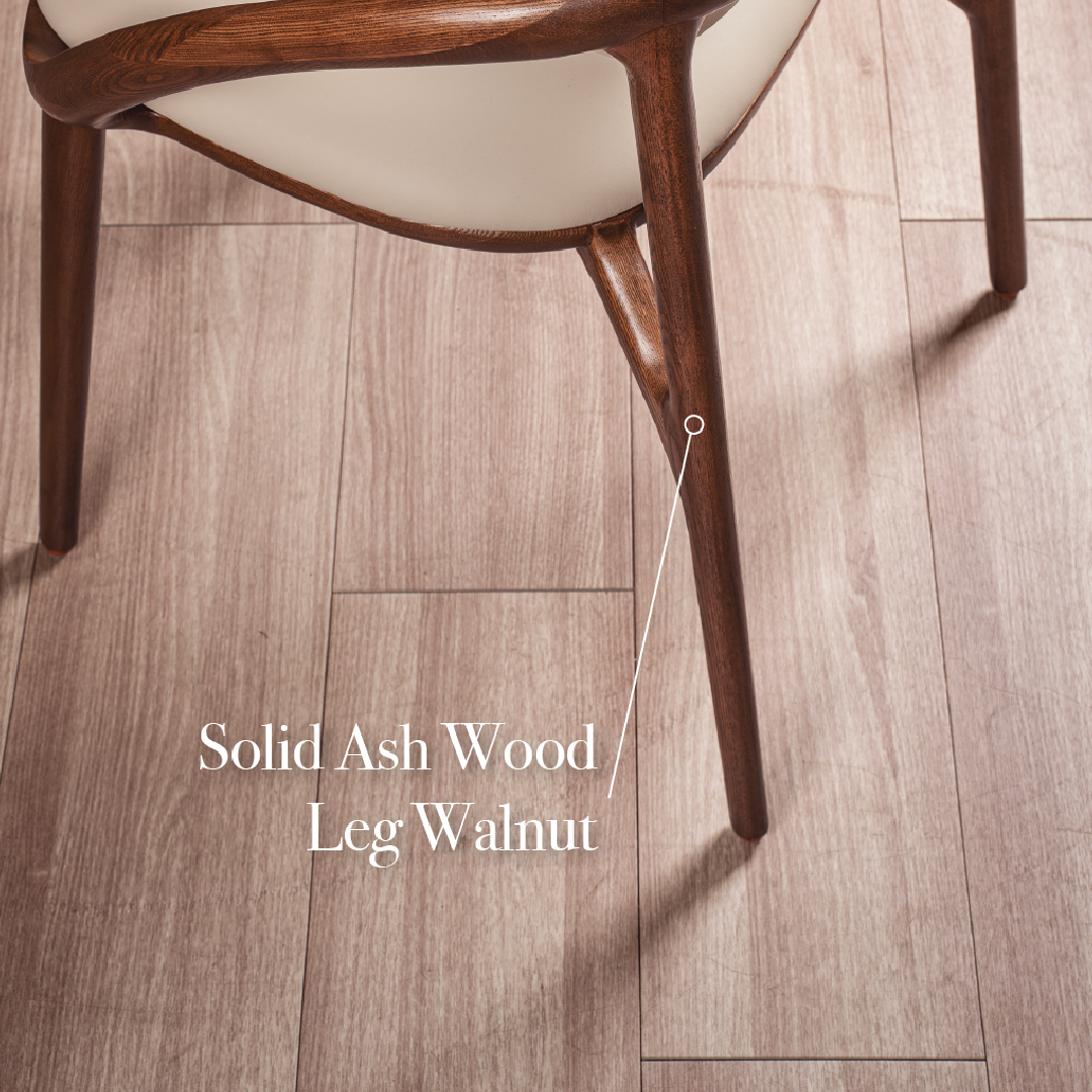 Off-white leather meets a sculptural walnut-finished ash wood frame in this armchair. Its curved open-back blends mid-century style with compact comfort, adding warmth and balance to modern living spaces.