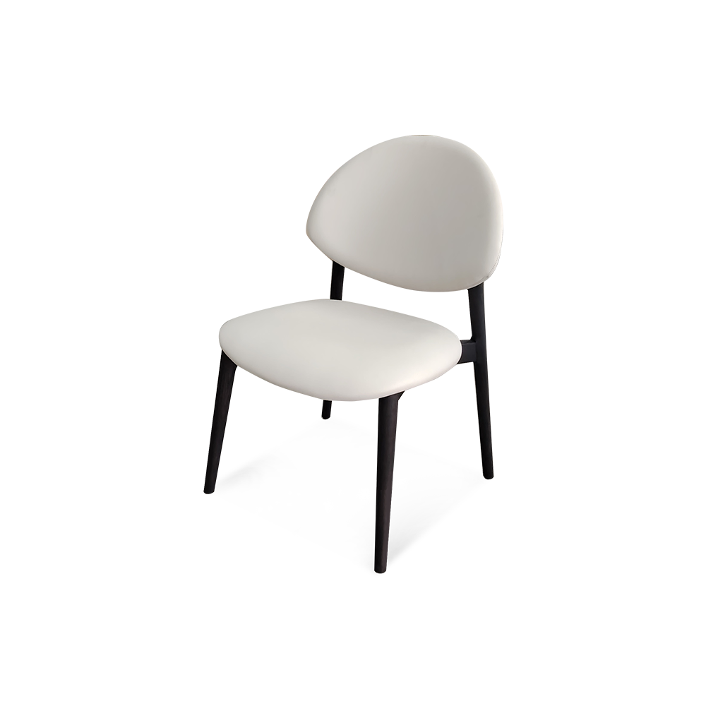 A versatile dining chair that blends soft textures with natural contrast. Light stone upholstery is complemented by dark brown solid ash wood legs, offering everyday comfort with a grounded, elegant presence at the table.