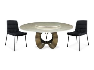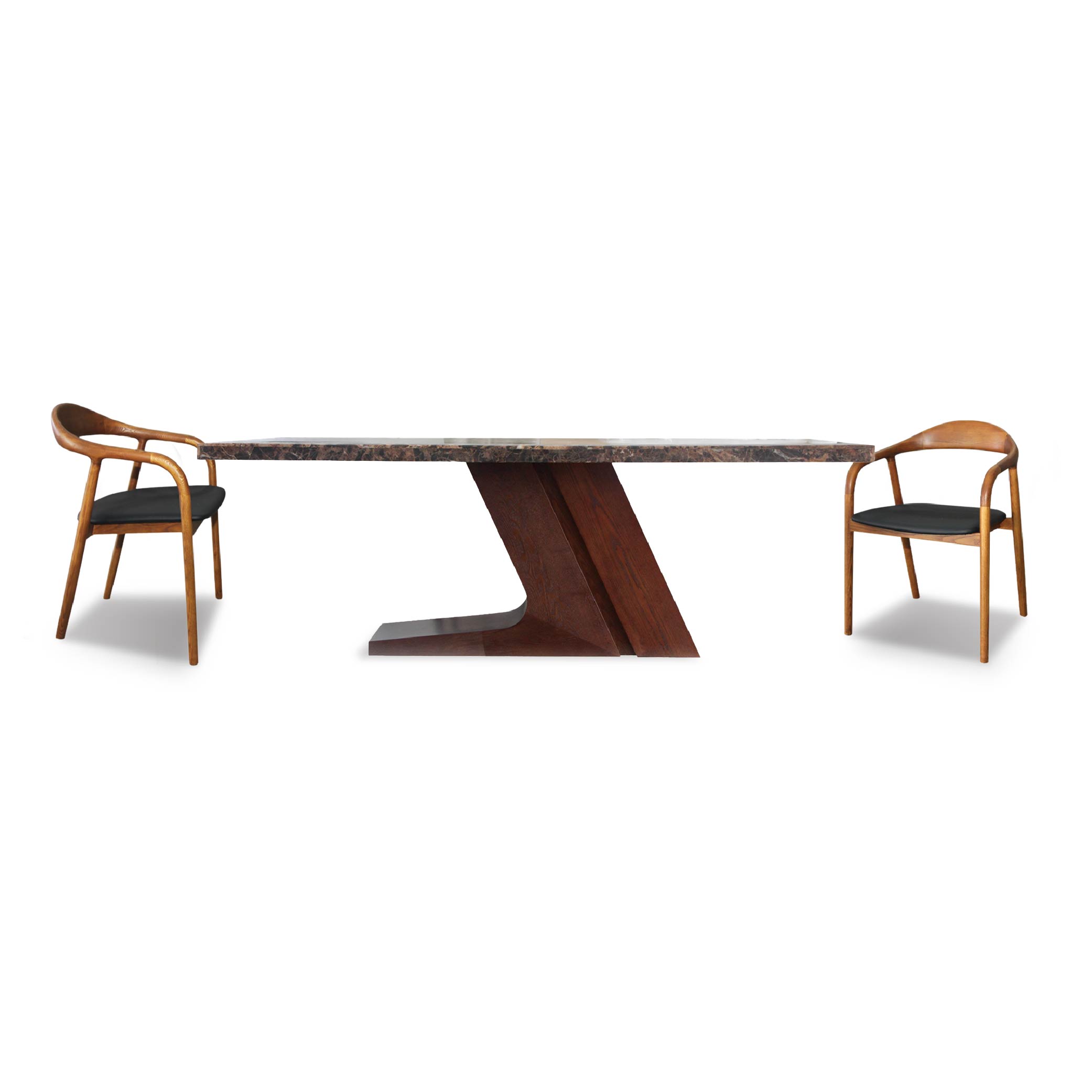 Bring a rich, earthy palette to the dining room with this Emperador marble dining table. Its dark, dramatic marble top rests on a sturdy Ash veneer wooden base, blending natural stone with warm timber. The set is completed by mid-century inspired dining chairs featuring Russia Ash wood legs in walnut tone.