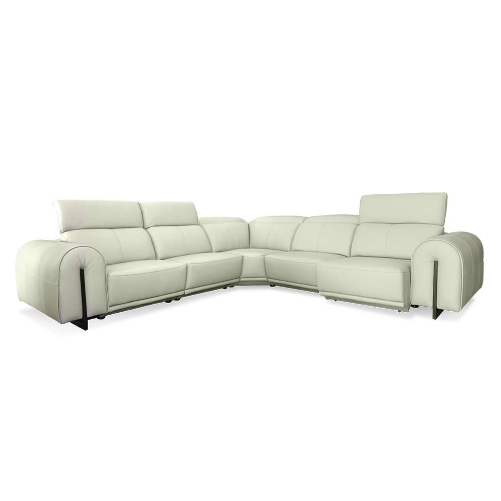 A Gamma full leather corner sofa designed for everyday relaxation. The built-in power recliner allows adjustable comfort, while the striking curve-shaped armrest adds architectural flair to modern living rooms and shared family spaces.