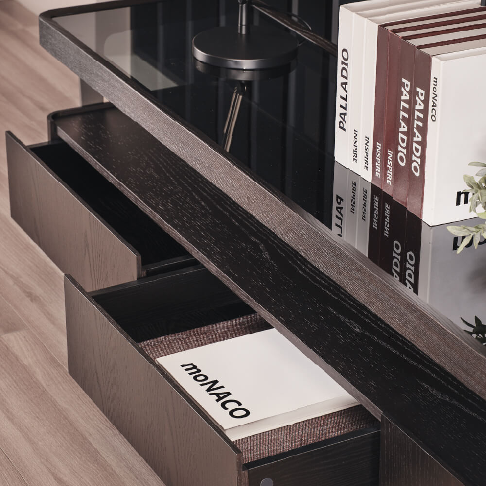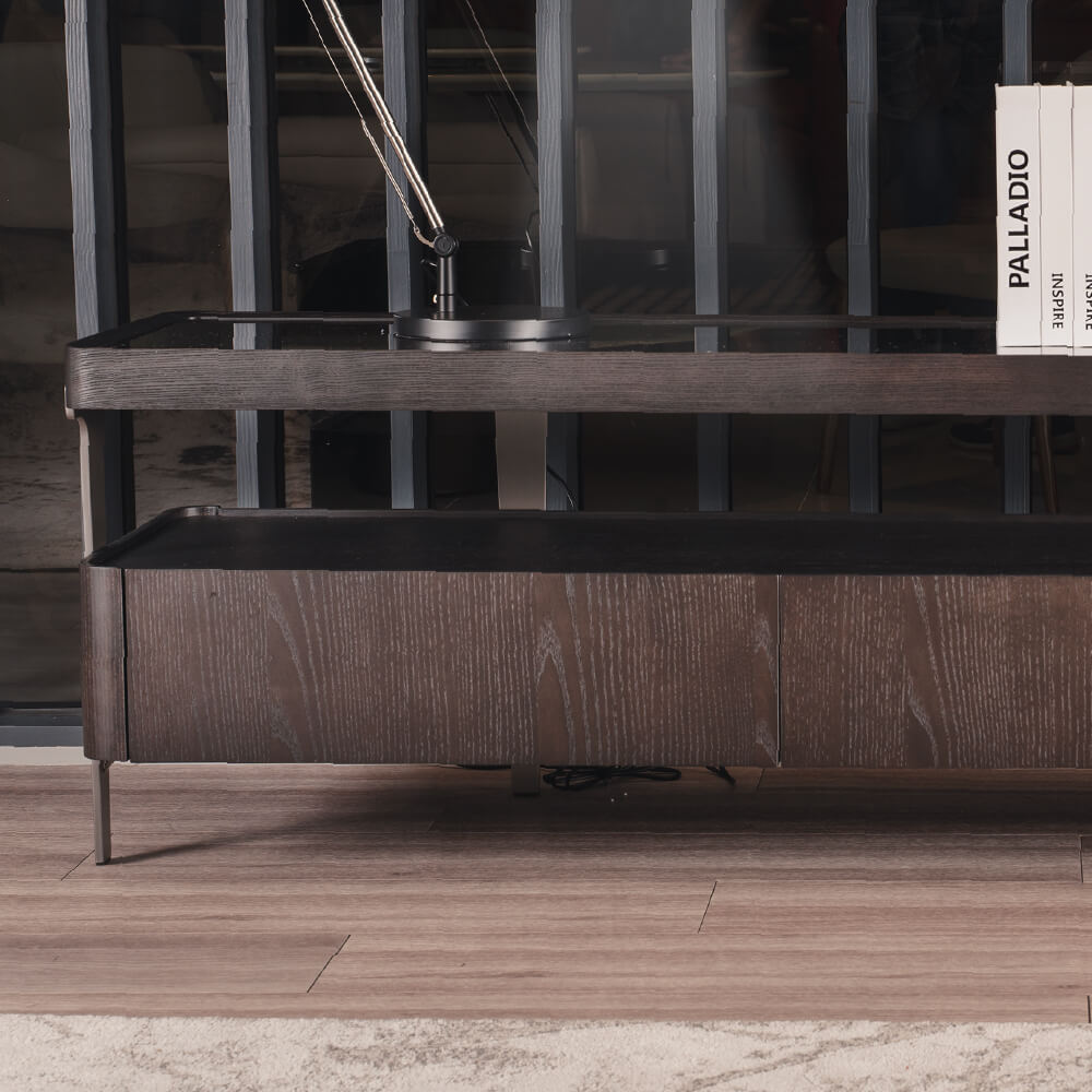 Functionally elegant, this TV cabinet combines a smoked tempered glass top with ash veneer storage and sleek metal legs. With concealed drawers and open shelving, it keeps the living space organised while maintaining a light, contemporary look.